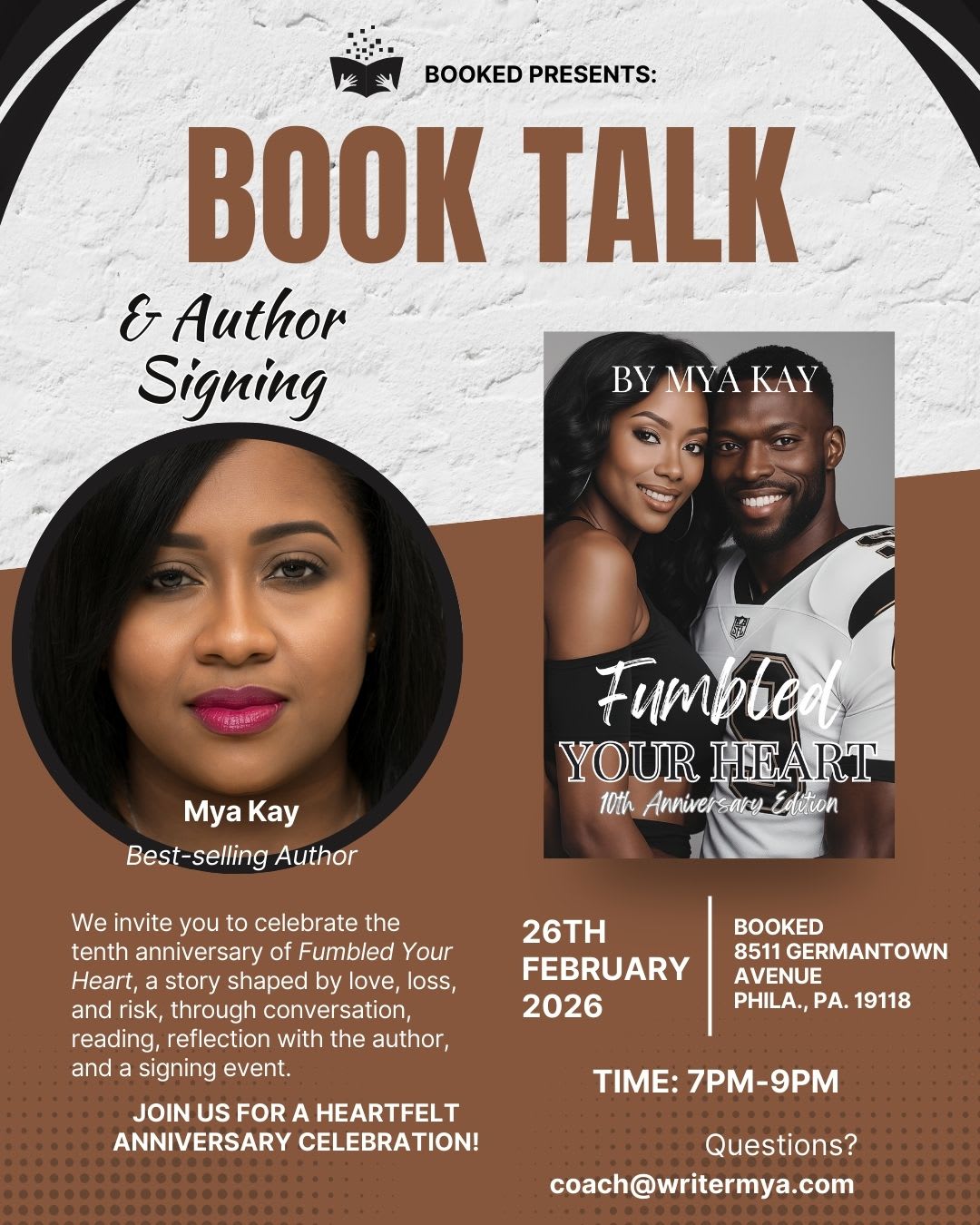 Mya Kay will be joining Booked in the shop on Thursday, February 26th at 7:00 pm to celebrate the 10th anniversary edition of her book Fumbled Your Heart, featuring a brief reading followed by Q & A and signing.